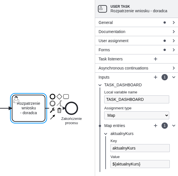 Zadanie użytkownika (**UserTask**) → sekcja \***Inputs**.