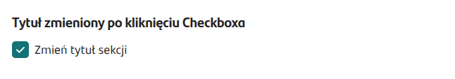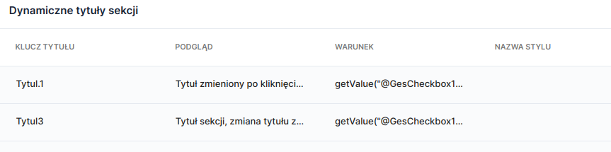 We właściwości **Dynamiczny tytuł sekcji** definiowane są warunki dla jakich tytuł sekcji ma ulec zmianie. Jeśli warunek `getValue("@GesCheckbox1")=="Y"` zostanie spełniony (czyli Checkbox1 przyjmie wartość Y - zostanie zaznaczony) to tytuł sekcji przyjmie wartość (**PODGLĄD**) wskazaną dla zdefiniowanego klucza **KLUCZ TYTUŁU** (czyli w tej sytuacji spełnienie warunku ustawia tytuł sekcji na *"Tytuł zmieniony po kliknięciu ..."*). Jeśli warunek nie zostanie spełniony, wyświetlany będzie tytuł podany we własności **Tytuł**.