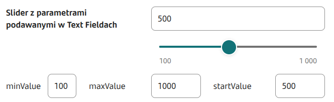 Jeśli wartość Slidera ma zostać przepisana do komponentu Pole tekstowe, komponent ten musi nasłuchiwać na Slider, a przepisanie wartości nastąpi albo przez wskazanie slidera w Źródło danych z innego pola komponentu tekstowego, albo dla Pola tekstowego zostanie ustawiona specjalna usługa (np. EchoService).