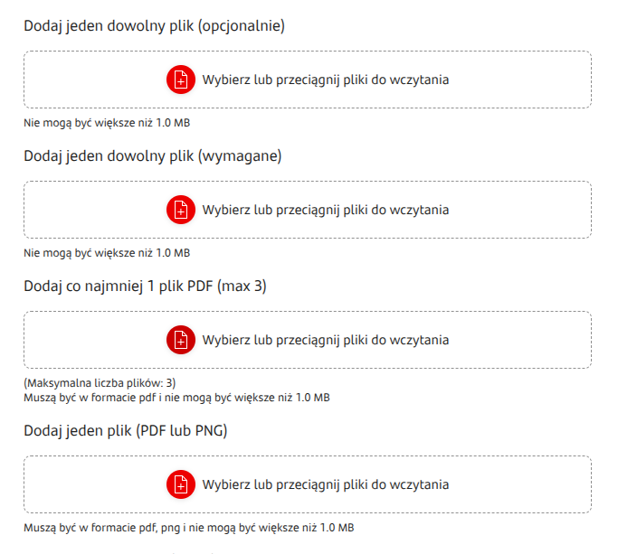 Włączenie opcji wyświetlania informacji o dopuszczalnych formatach oraz maksymalnym rozmiarze załączanego pliku (domyślnie opcja jest wyłączona). Przykładowa informacja: "Dopuszczalne formaty załączników: pdf (max. 1 MB)"