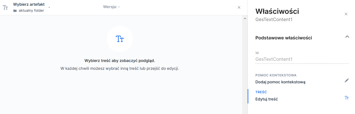 After adding the component Formatted content from the base components panel, it must be supplied with an artifact containing the content. With the component selected, choose in the component properties panel in the field CONTENT window the Edit content. This will open the panel and display information about the lack of a selected artifact. To choose an artifact use the selection field Select artifact located in the panel header. Choosing an artifact automatically selects the latest version. The version can be changed using the selection field Version.