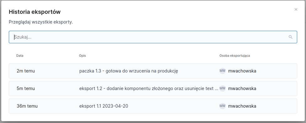 button, located in the bar in the top right corner of the screen, allows you to display a dialog window with the history of all application exports along with the date, description and information about the user who performed the export.