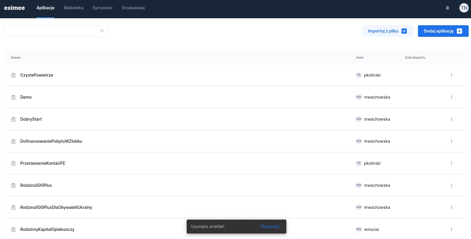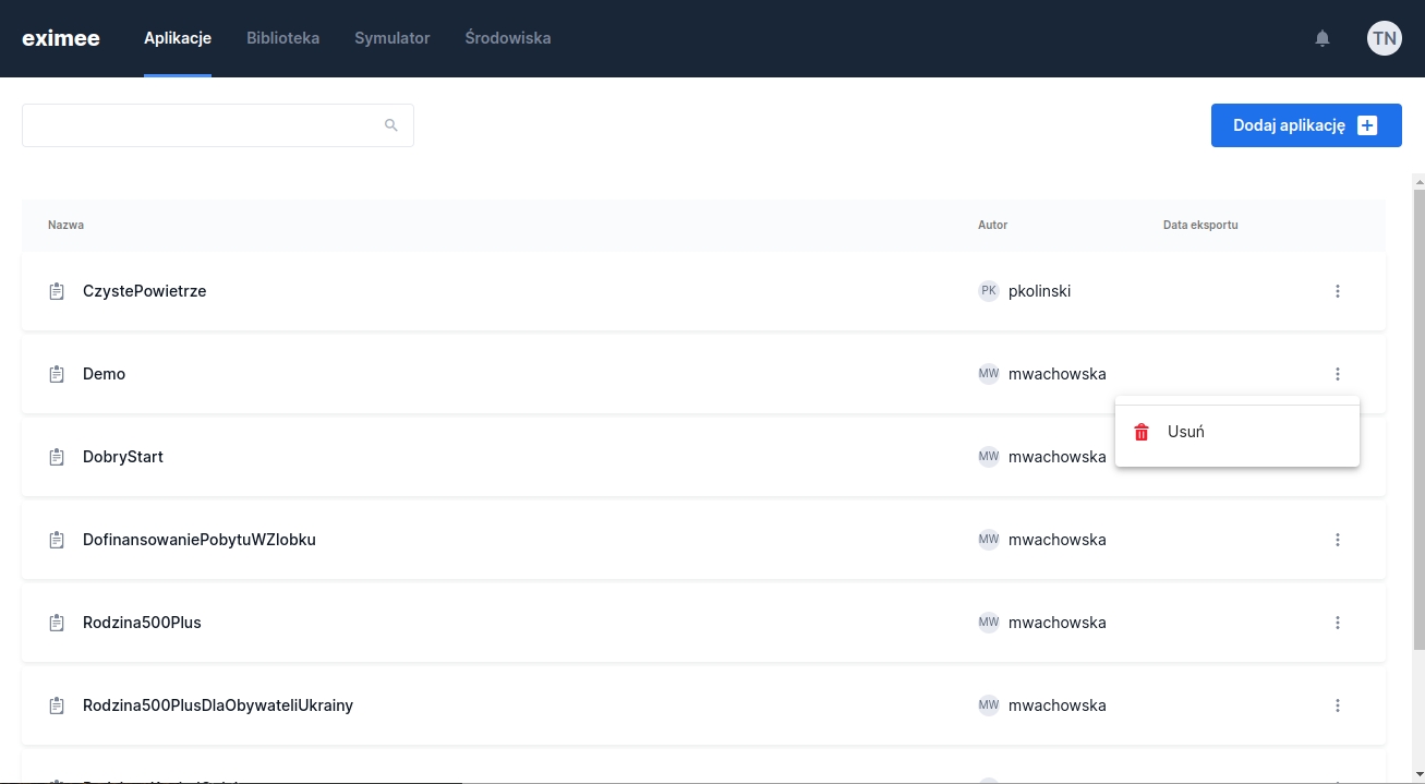 To delete an application, while in the module window Applications, click at the end of the row of the given application the context menu and select the option Delete.