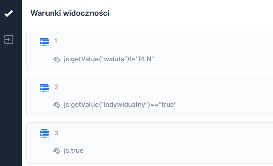 We add conditions in the side panel Visibility conditions, which will slide out after clicking the button on the left bar