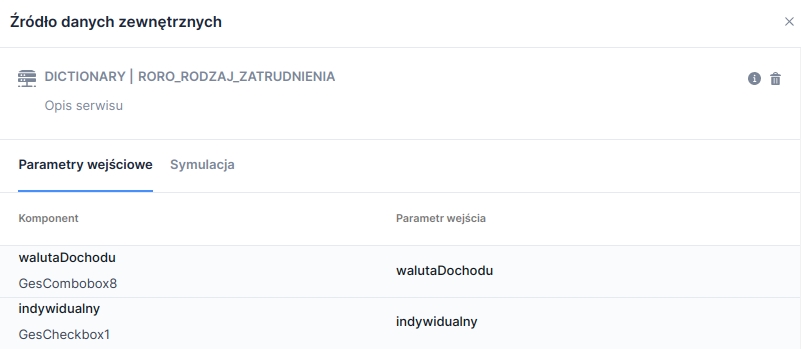 We attach the conditional dictionary in the same way as a regular dictionary (instruction: Connecting a dictionary data source). The only difference is that you must additionally specify mappings of input parameters to components: