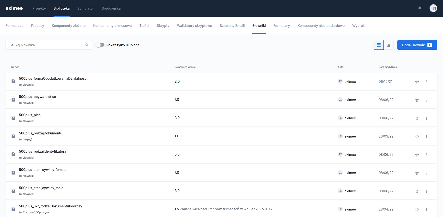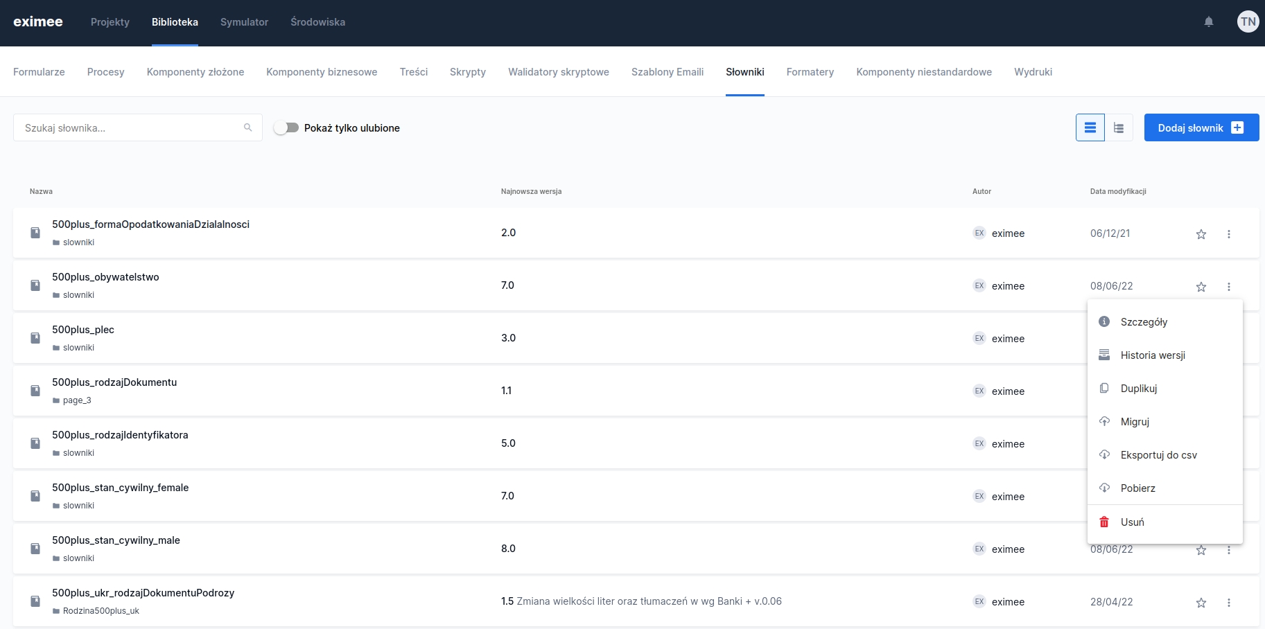 The dictionary export mechanism allows you to download a given dictionary in CSV format. To do this, go to the Library, then enter the Dictionaries.