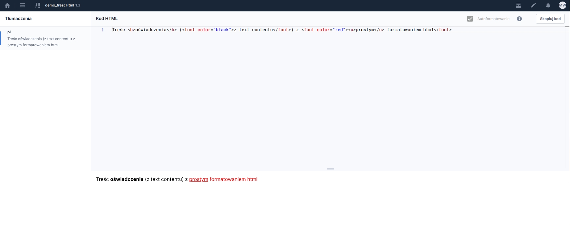 After navigating to a specific content item, you can start editing the artifact and save its new version. Available translations are displayed on the left, and on the right the HTML code preview and the target appearance of the content (rendered HTML) are shown.