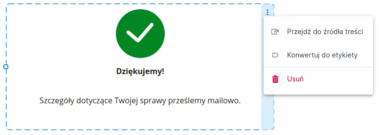 The context menu of a Formatted Content placed on the form that has a correctly mapped external data source contains the option Convert to label. After pressing it, the Formatted Content will be converted into a Label. Component properties that also apply to the Label will be copied over. Individual translations of the formatted content will be saved under the newly created translation key for the Label text.