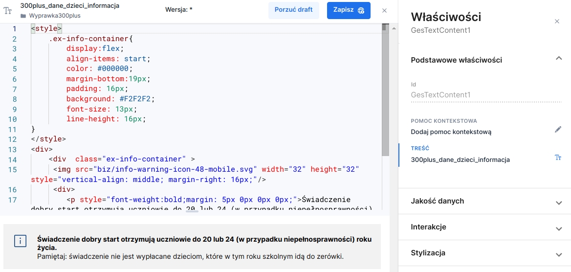 Formatted content can be edited in the content editor (Content editor) or directly where it was added (on the form or in a composite component). In the second case this is done using the Content tab on the component properties panel Formatted content. In edit mode the edit button is replaced by the buttons Discard draft and Save. The artifact name and version selection fields become locked.
