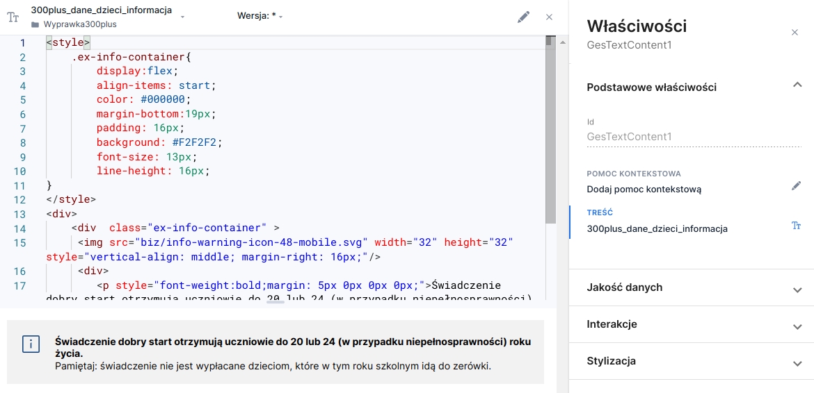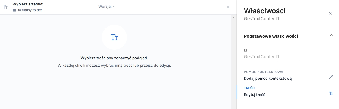 After adding the component from the base components panel Formatted content it must be fed with an artifact containing the content. With the component selected, choose in the component properties panel in the field CONTENT window the Edit content. This will open the panel and display information about the lack of a selected artifact. To choose an artifact use the selection field Select artifact located in the panel header. Selecting an artifact automatically selects the latest version. The version can be changed using the selection field Version.