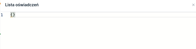 Opening the statements editor results in a drawer sliding out presenting an area to enter text in JSON format. For a newly created component it contains only empty curly braces. Line numbers are visible on the left side of the editor.
