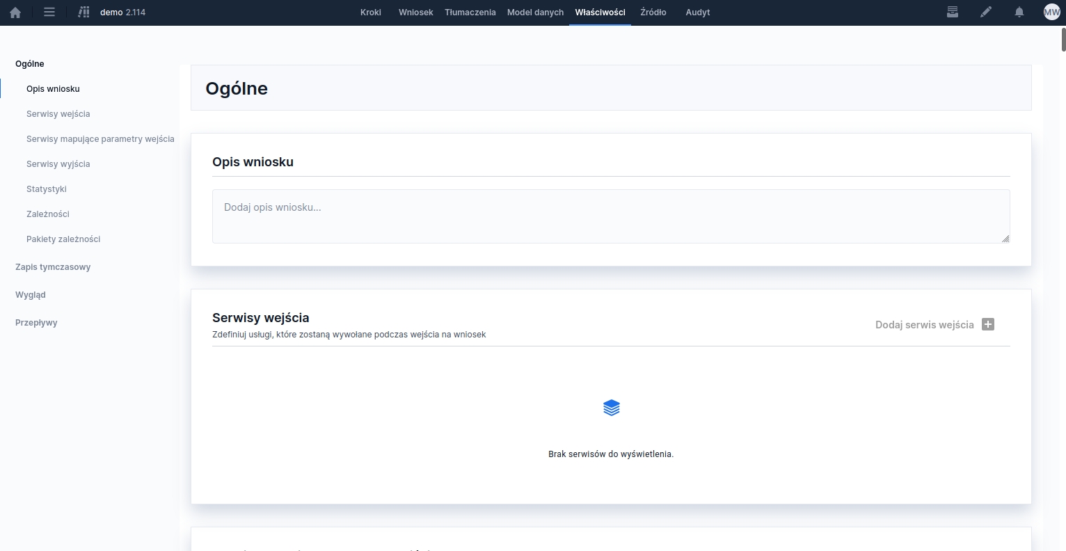 Section Services mapping input parameters allows connecting services whose task is to populate the form fields with data even before it starts. These services are launched automatically upon entering the application - both during a standard form open and in the case of its unparking (resuming the session).