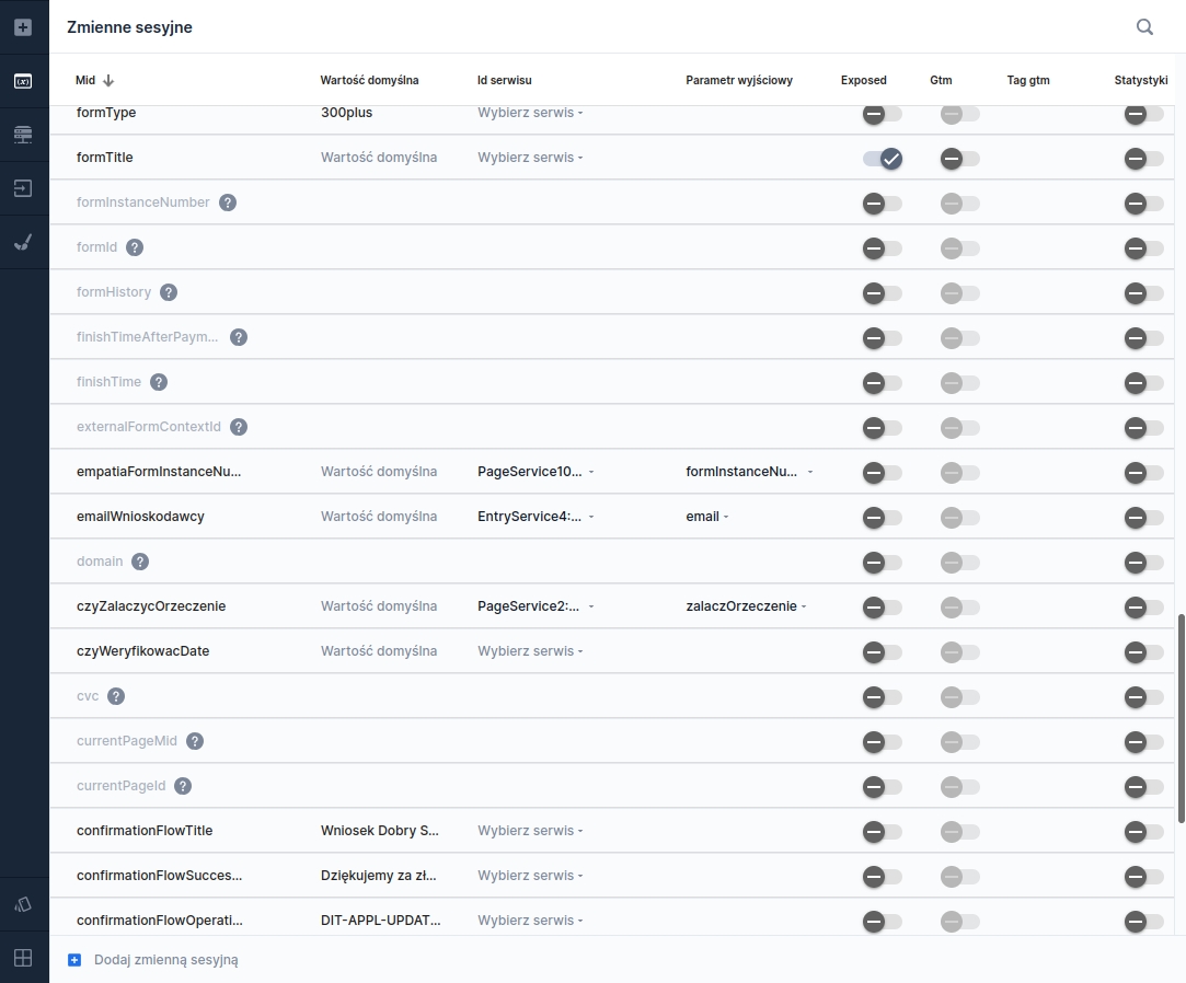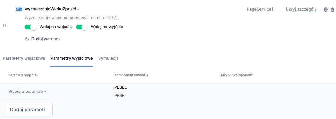 In the output parameters tab we click the Add parameter — this will display a row in which first, in the Application componentcolumn, we choose the session variable for which we want to map the output, and then in the Output parametercolumn, we indicate the appropriate output: