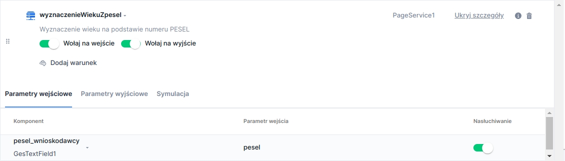 After the list of services available for the application appears, we look for the appropriate service, then reveal its details by clicking the option on the right side of the panel Show details. Mapping the service output to a variable will be possible after clicking Output parameters in the displayed details:
