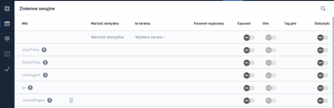 The view for managing session variables is the Session variables. To open it, select the option in the left menu Session variables. On the right side of the panel title bar there is a magnifying glass icon that allows searching the list of variables.
