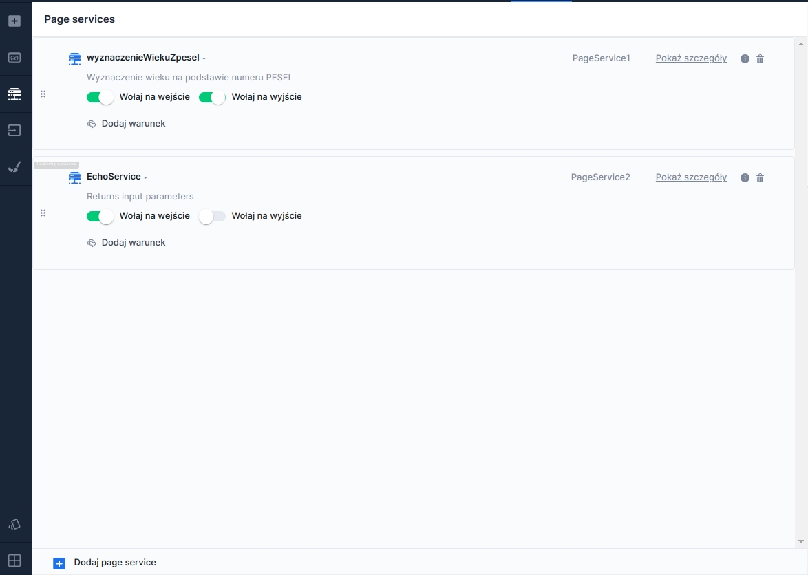 We define mapping of the variable to the appropriate service output field in the Page servicespanel, which we open by clicking the Page services: