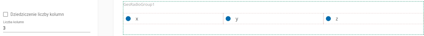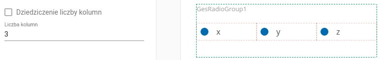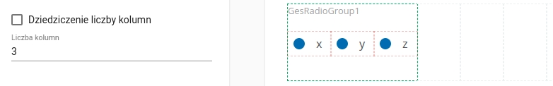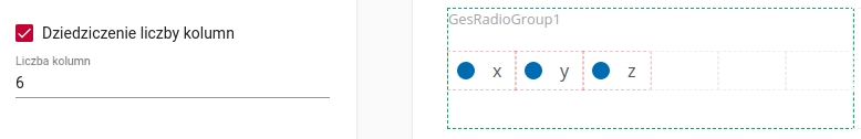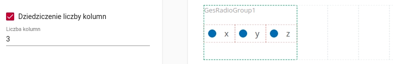 Composite components (e.g., tile group, radio group) have the option to enable the Inherit number of columnsproperty. It causes the column widths in the component to be the same as in its parent. This is achieved by ensuring that the component's width always corresponds to its number of columns. When changing the width of such a component, columns will be added or removed accordingly. Because of this, you can reduce the component's width only if it contains empty columns.