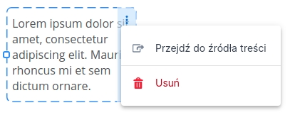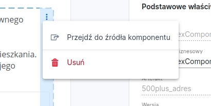 Components can be removed by clicking the menu button located in the upper right corner of the selected component, then choosing the Deleteoption. If removing the component is not possible, the delete icon does not appear.