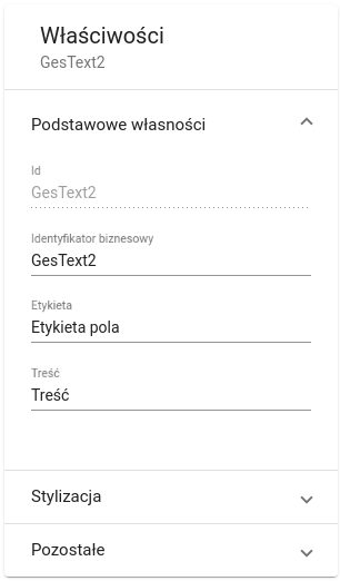 Properties are grouped into sections. Clicking in a place not occupied by any component or outside the page area allows previewing the properties of the entire page.