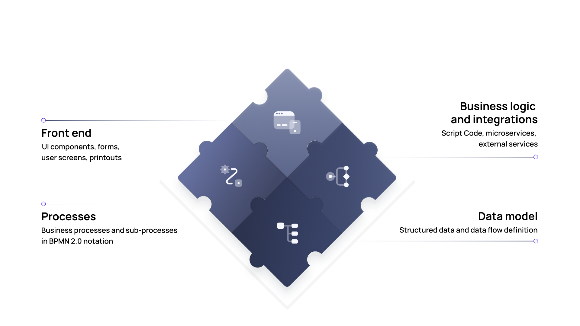 Każda aplikacja opiera się na czterech podstawowych elementach: **modelu danych**, **procesie biznesowym**, **logice aplikacji** oraz **warstwie front-end**. Elementy te można łączyć w zależności od potrzeb – nie każda aplikacja wymaga ich wszystkich.